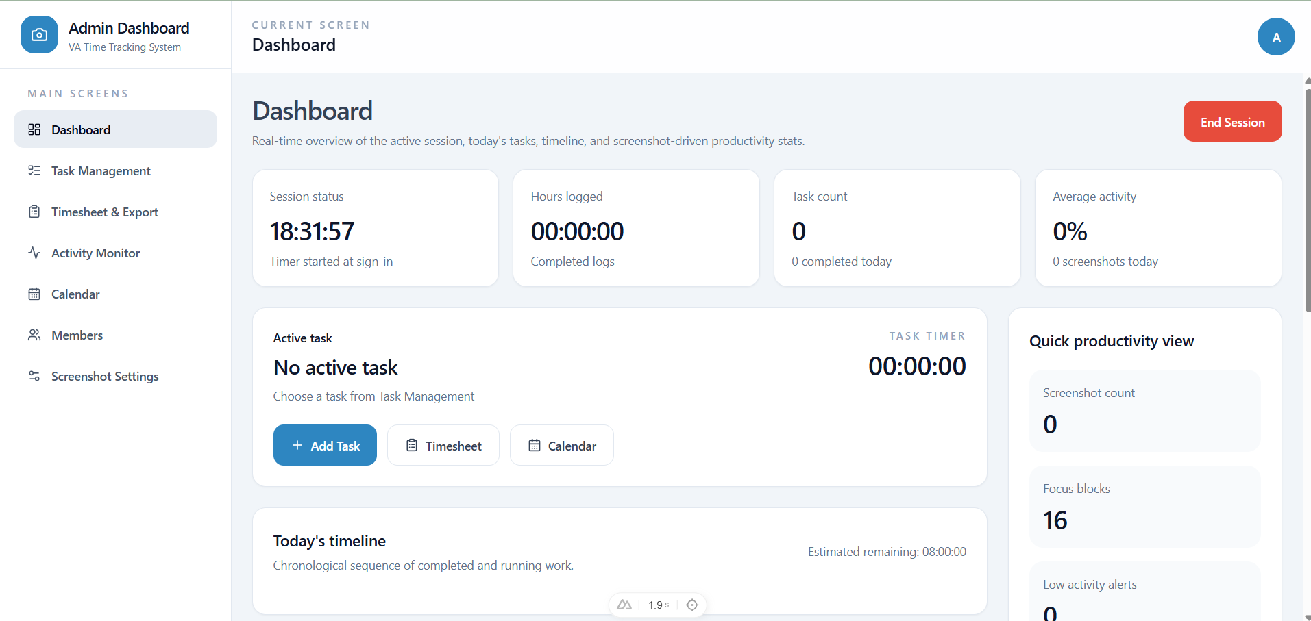 Members clock in, run timers, capture screenshots, and stay tracked from a dedicated Electron app.